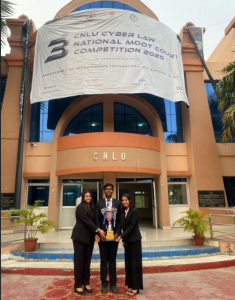 The team comprising Abhijeet Patra, Akanksha Mishra, and Kritika Kumar from the Institute of Law secured the Runner-up position at the 3rd CNLU Cyber Law National Moot Court Competition, 2025 organised by Chanakya National Law University from April 12-13, 2025.